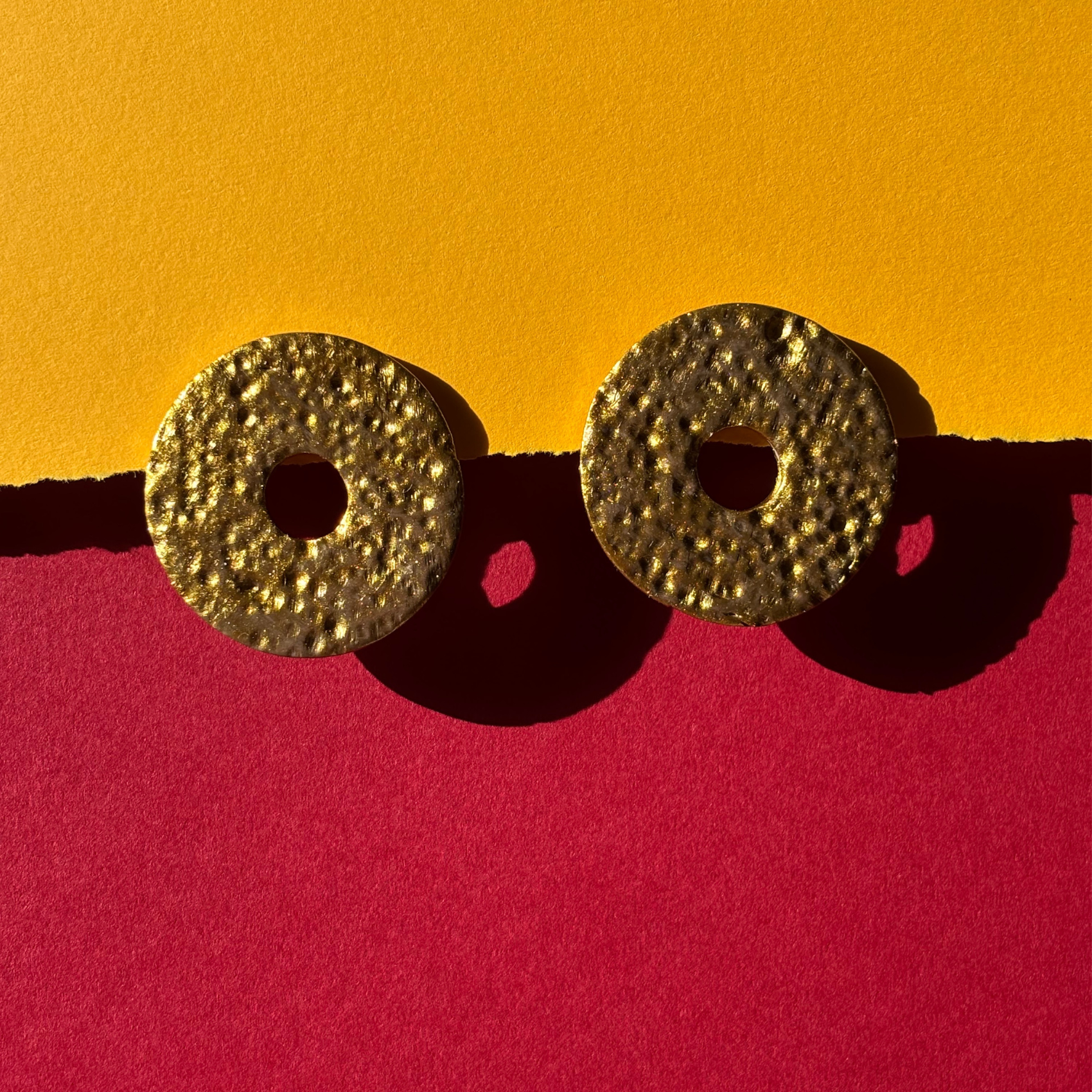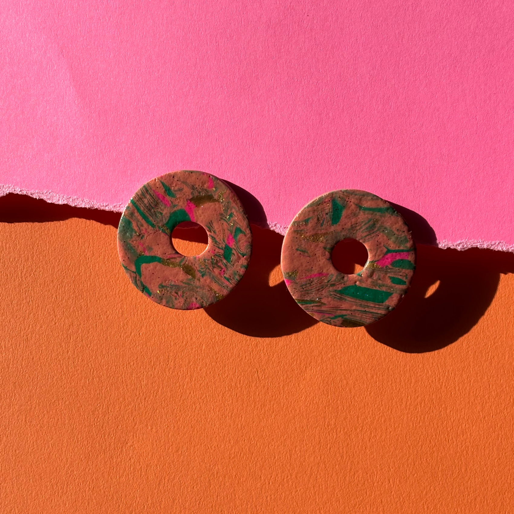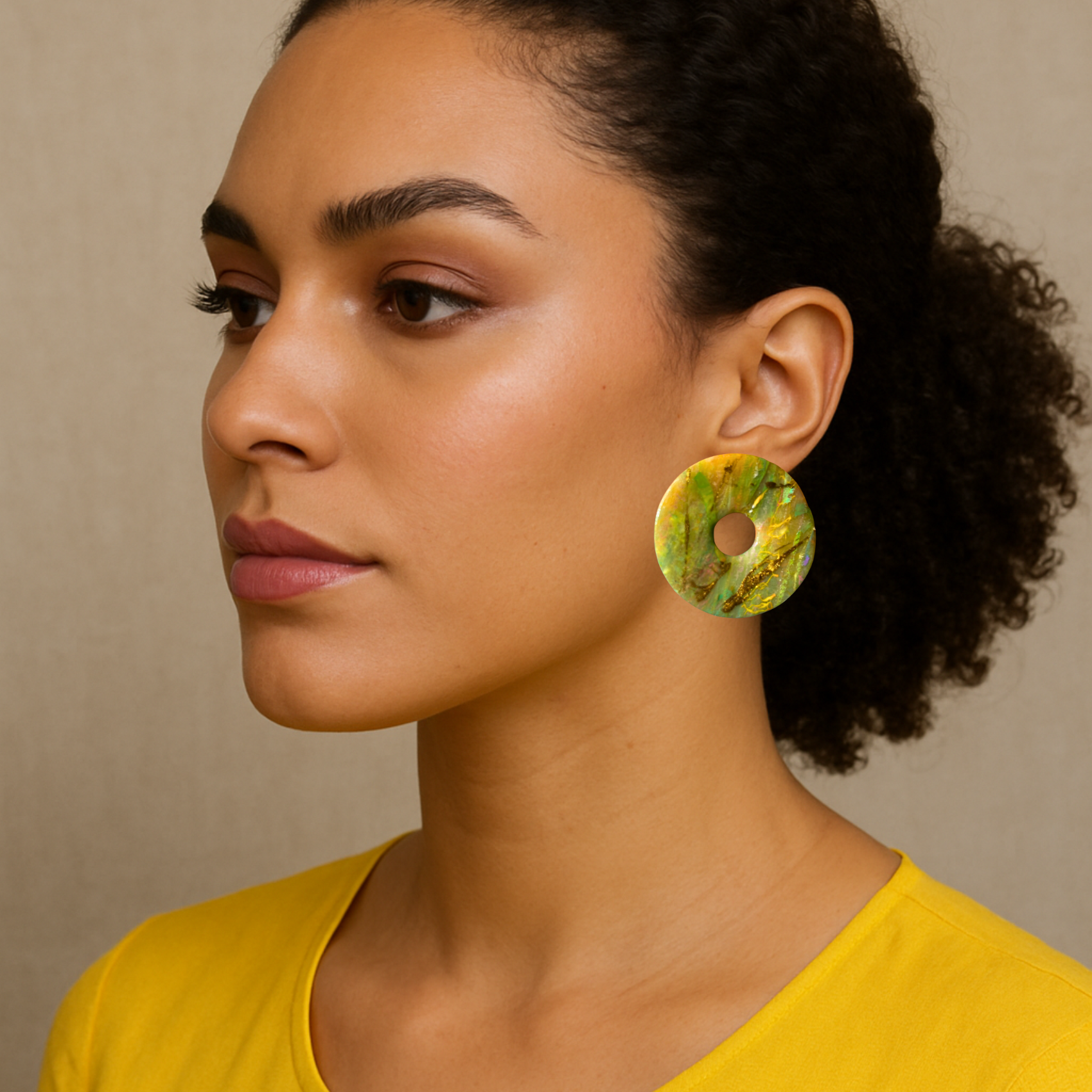 Round statement stud earrings in various styles. Lightweight and fashionable. Add a pop of style and color to any outfit.