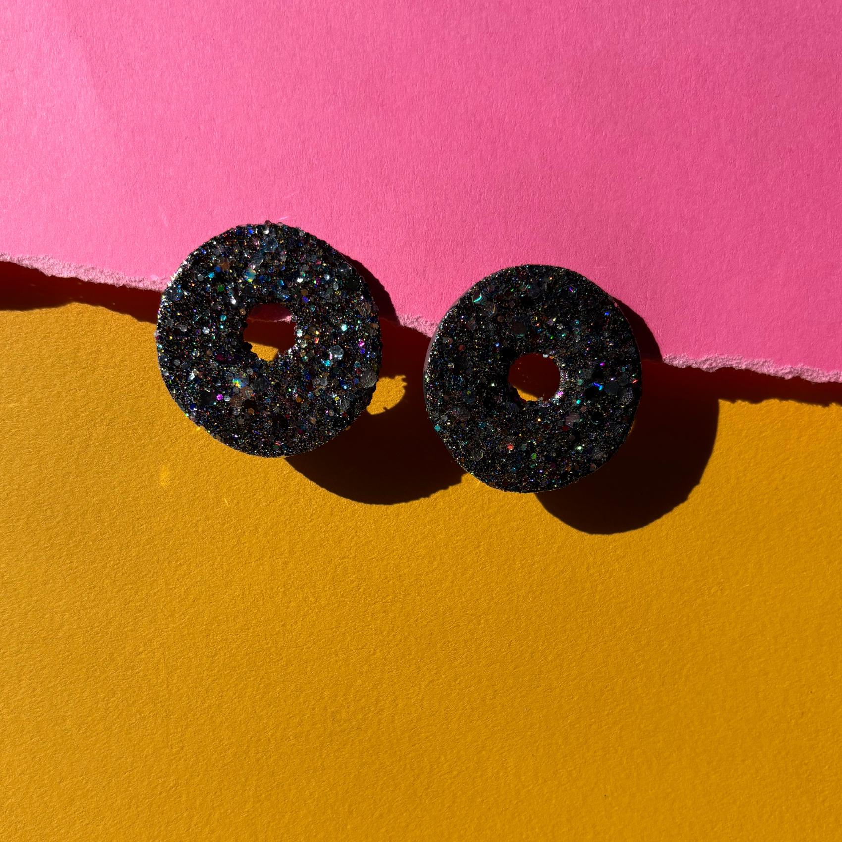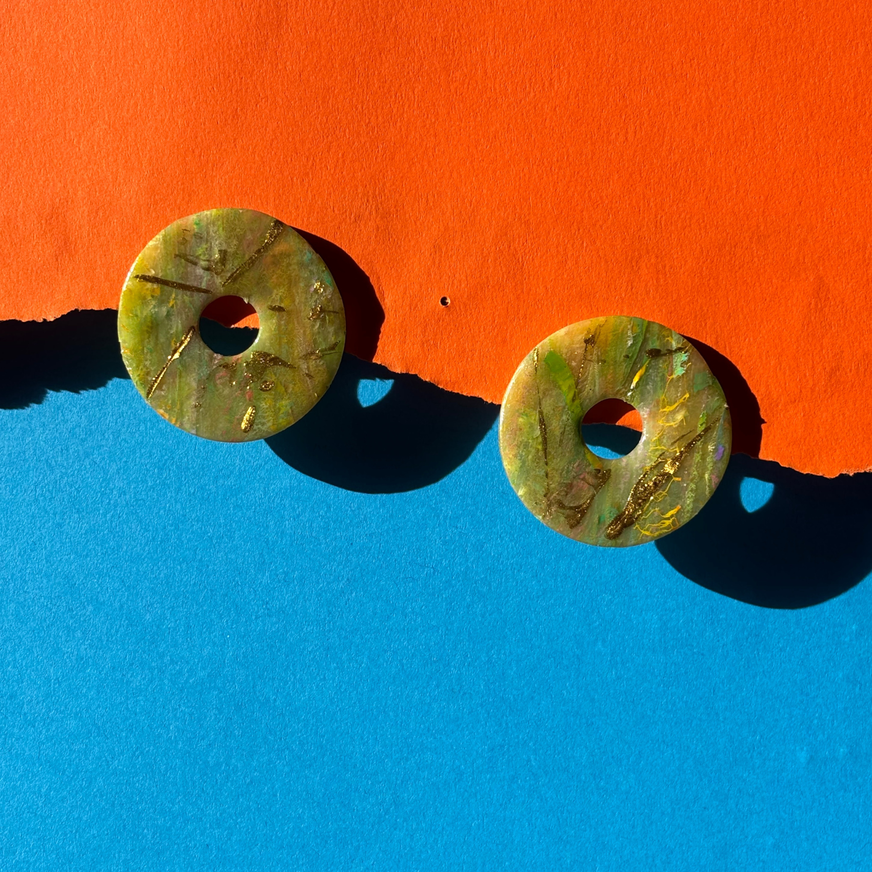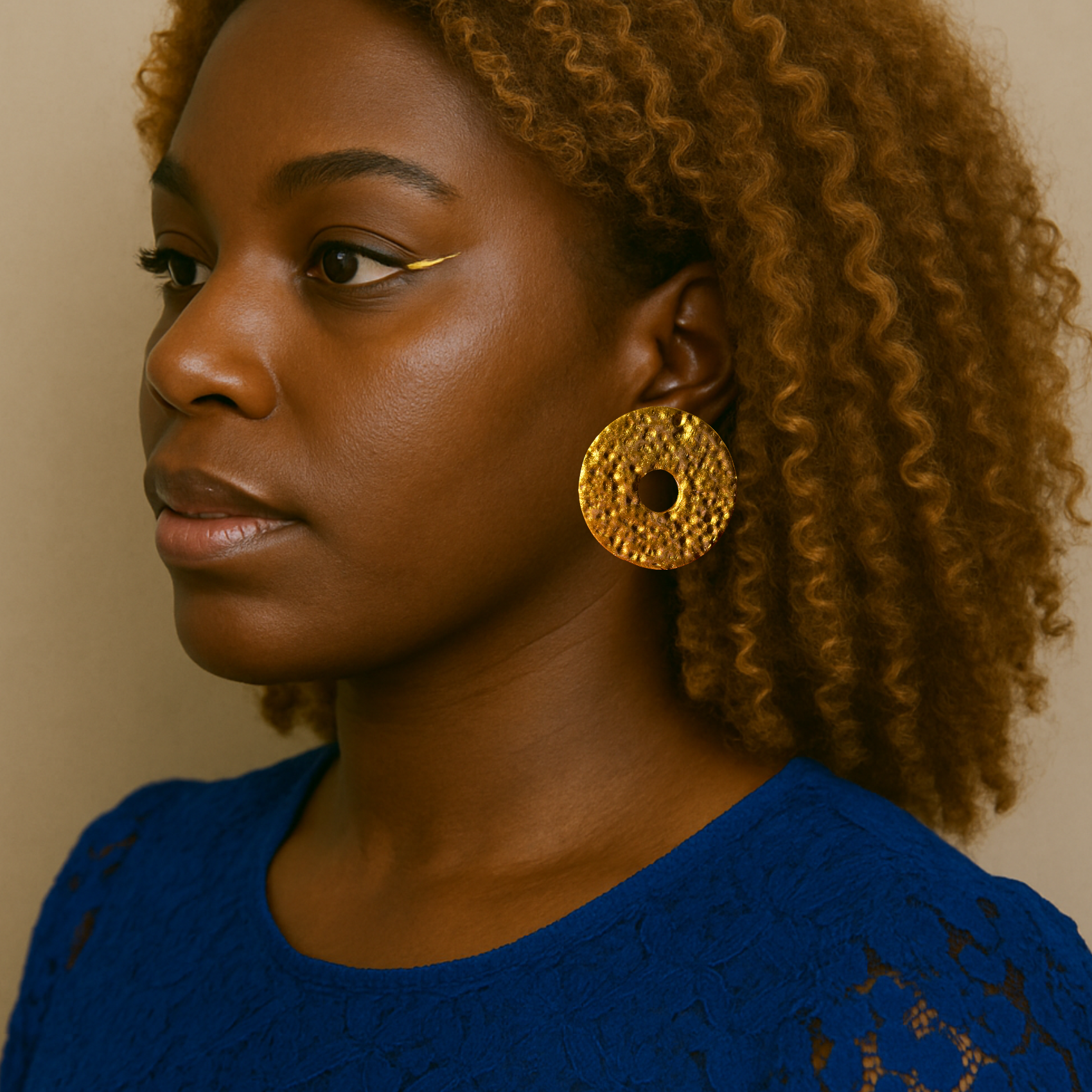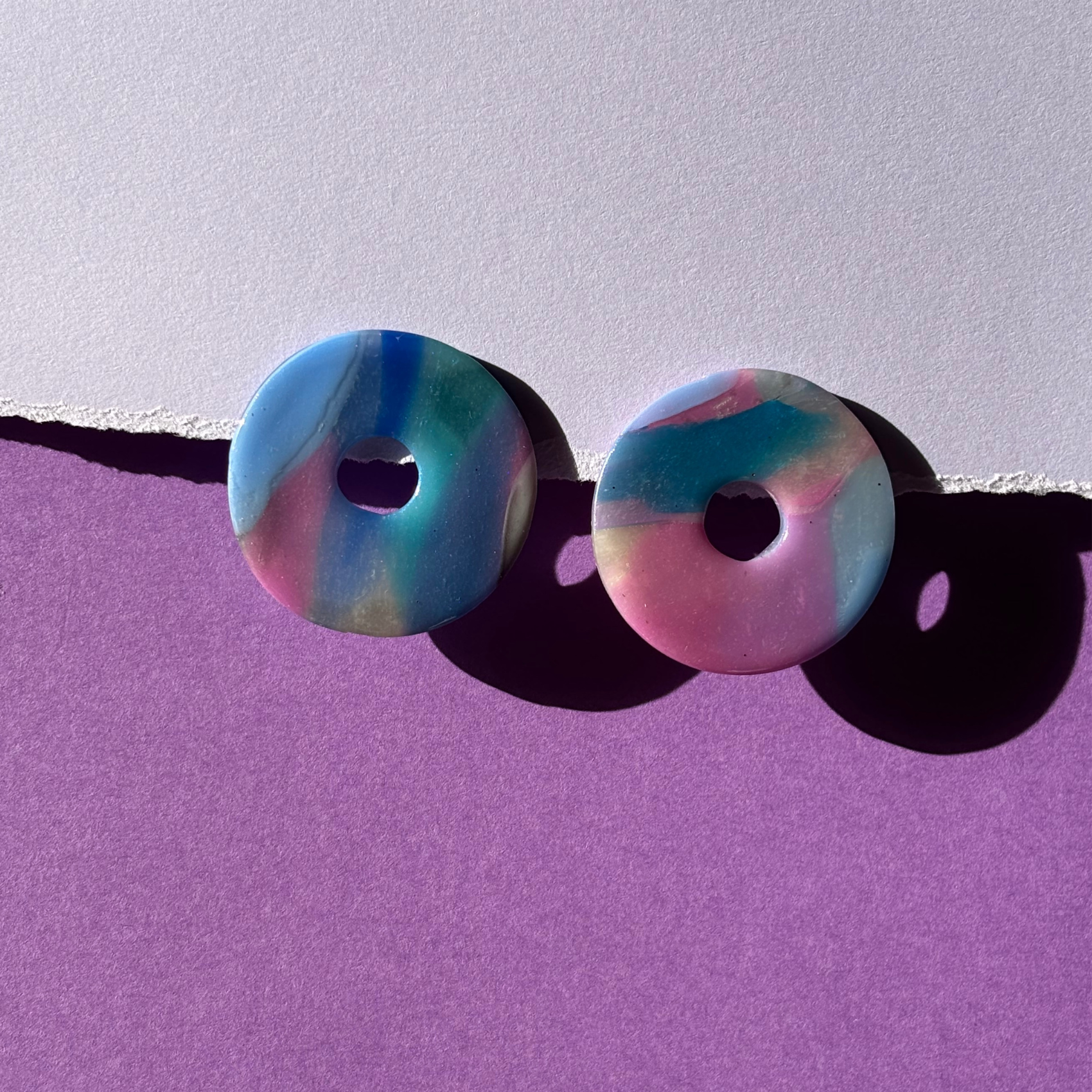 Round statement stud earrings in various styles. Lightweight and fashionable. Add a pop of style and color to any outfit.